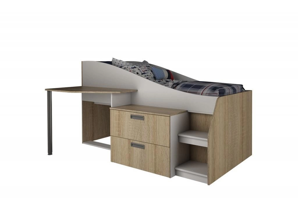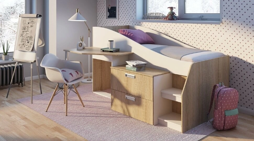 Уголок включает спальное место стандарного размера 1900*800 мм. Стол размером 950*500 мм можно использовать для учебы или как прикроватную тумбу. Два вместительных ящика позволят хранить школьные принадлежности, игрушки или одежду. Использование в декоре врезных ручек делает эксплуатацию данной мебели комфортной.