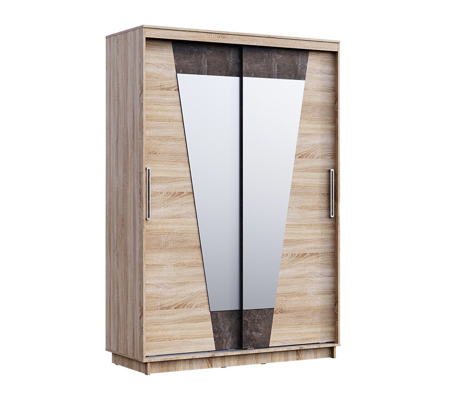 - Раздвижная система - нижнеопорная, изготовлена из алюминиевого профиля, за счёт которого увеличивается срок эксплуатации данного изделия. Легкое перемещение дверей и плавность хода обеспечивается за счет роликов, оснащенных шариковыми подшипниками. Регулировка зазоров и положения дверей производится с помощью регулировочных винтов на роликах. Для фиксации створок в закрытом положении используется металлический стопор, который фиксируется в направляющих, а специальная мягкая щётка-шлегель, приклеенная на торец створок, обеспечивает их бесшумное закрывание и защищает вещи от пыли. Цокольный подиум имеет высоту 80мм и смещён от краёв шкафа, что позволяет устанавливать шкаф вплотную к стене не затрагивая установленный напольный плинтус. Максимальная нагрузка на роликовые направляющие, при равномерно распределённой статичной нагрузке, до 8 кг. Зеркало трапециевидной формы размером 1540 х 490 мм. в количестве 2х штук.