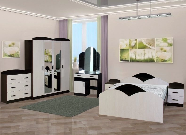 Спальный гарнитур «Золушка» пользуется особой популярностью – он привлекает своей легкостью, интересным дизайном и высокой функциональностью. Выбрав эту спальню, можно быть уверенным, что полноценный отдых вам будет обеспечен. Комплектация модели включает в себя кровать с ламелями, большой шкаф, две прикроватные тумбочки, комод (на 3 выдвижных ящика), трельяж, а также качественный ортопедический матрас. Материал, из которого изготовлялась мебель, отличается долговечностью и прочностью. Если вам нужна функциональная, но вместе с тем комфортная и красивая спальня, эта модель подойдет вам лучше всего.