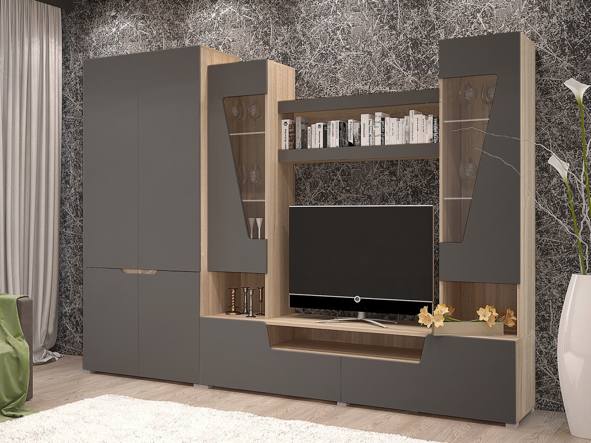 - Набор состоит из 2х ств. шкафа, тумбы, надстройки с витринами. Гостиную можно доукомплектовать комодом и подсветкой стеклополок.